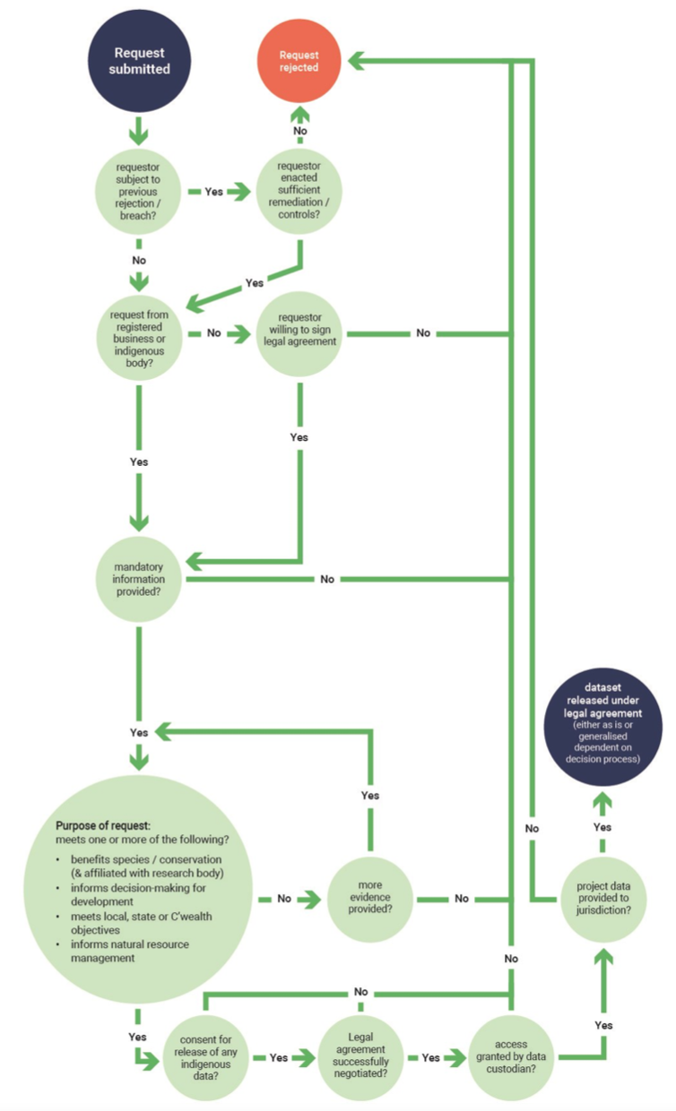 Normally, requests meeting criteria and requesting access to a localised geographic area, or data for a single or small group of species should be approved. Requests for data at a jurisdictional or national level should receive greater scrutiny.