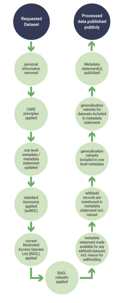The rulesets which apply to RASLs may include generalisation / withholding of some attributes for particular species as outlined under Species-related categories in Principle Restricted Access Species Data (RASD) Should be Consistently Classified. Where information for a particular attribute has been removed, row level metadata should reflect that this has occurred and the ruleset for this change. Reasons should be standardised and align with the species-related categories in Principle Restricted Access Species Data (RASD) Should be Consistently Classified. The instances where generalisations are applied are outlined in Supplement 5.